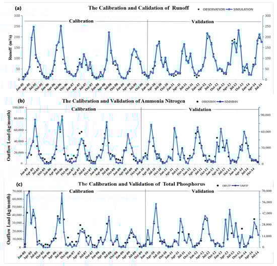 The calibration and validation of (a) runoff, (b) ammonia nitrogen, and (c) total phosphorus. Black points indicate observed values. Blue lines indicate simulated values.
