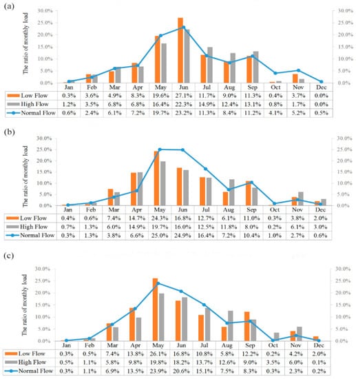 The percentage of monthly load of (a) ammonia nitrogen, (b) total nitrogen, and (c) total phosphorus in different hydrological years.