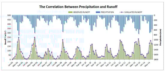 The model was calibrated using observed values from 2005 to 2009 and with an optimal set of parameters. Results of Re < 10%, R2 > 93%, and Ens > 91% were obtained. Then, we input the best parameters and reran the model over the validation period (2010–2014). The results of the simulation well-agreed with the observed values, with Re < 15%, R2 > 89%, and Ens > 90%. The comparison of the simulated and measured values of runoff is shown in Figure 4a.