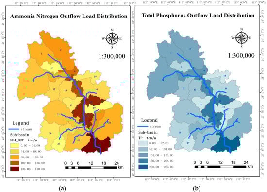 The spatial distribution of the average annual load of ammonia nitrogen (a) and total phosphorus (b). Sub-basins are numbered in dark blue with gray boundary lines.