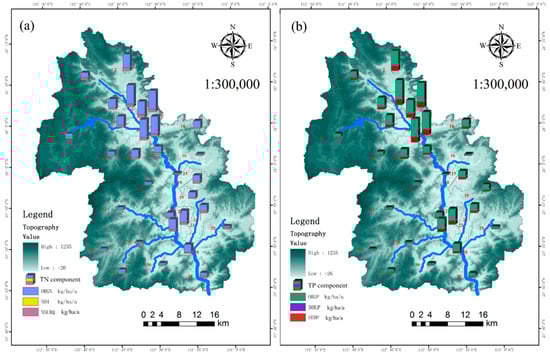 Here, we analyze the generation distribution of NPS. It is focused on a sub-basin’s own pollution yield, and not the total outflow load that could be derived from other sub-basins. Researchers have usually focused on land cover with the spatial distribution of NPS, and studied the impact of land use change on NPS distribution [,,]. Considering the gentle rolling/hilling topography and unchanged land cover of the watershed in the study area, we focused on NPS generation with topography. The main components of TN and TP generation under the topography conditions are depicted in Figure 8.