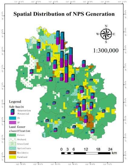 Additionally, we classified the sub-basins into three ranks (relatively low, medium, relatively high) based on Φi, the generation potential of “TN + TP”. In the first rank, Φi is less than 1.6. This rank generates little pollution; examples are sub-basin Nos. 15, 17, and 26. The terrain is relatively high, and the land cover is mainly thick evergreen forest. Although precipitation is relatively high, the densely distributed vegetation alleviates pollution loss by rainfall. In the second rank, Φi is between 1.6 and 3.0. This rank generates a medium level of NPS; examples are sub-basin Nos. 18, 19, and 20. The terrain is relatively low. The land cover contains forest, grassland, and small amount of agriculture. There is a medium amount of precipitation. In the third rank, Φi is greater than 3.0. This rank generates a relatively high level of pollution; examples are sub-basin Nos. 2, 6, and 9. The terrain is low and the precipitation is relatively high. The land cover is mainly farmland and residential. Without densely distributed forest, the last rank generates a large amount of NPS pollution by human activities and rainfall scouring. This is consistent with the results of studies on the impact of land cover change on NPS pollution [] that show that an increase in farmland or residential areas and a reduction in green vegetation would increase the NPS pollution to a large extent [,,,,]. These are the CSAs that demand special attention. The generation potential of “TN + TP” and land cover is depicted in Figure 9.