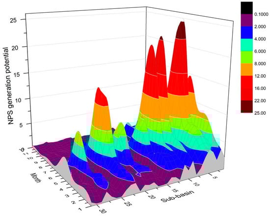 As shown in the figure, the x-axis represents the 31 sub-basins, the y-axis represents the 12 months in a year, and the z-axis represents the generation potential of NPS. It can be seen that the distribution of NPS generation potential in the study area is not balanced, whether on the time scale or the spatial scale. Firstly, the x-axis of the geographical space is from right to left. It can be seen that the upstream area (sub-basin Nos. 1–11) has a relatively high potential for NPS generation, followed by the middle districts (sub-basin Nos. 22 and 23). As for the central margin and southern part of the watershed, only sub-basin No. 28 has a slightly higher NPS generation potential; the overall NPS generation potential throughout the 12-month period is relatively low. Moreover, from January to December, it can be seen that the highest NPS generation occurs in May and June, and is concentrated mainly from April to July. In addition, for some CSAs (sub-basin Nos. 2–6 and 9), the NPS generation potential in February and March is also relatively high. Researchers studying the NPS in farmland in southern China obtained similar results, except for the rainy season. February and March also have high NPS load [], which could be attributed to the tillage and fertilization of farmland in this period. Therefore, during this time, we should focus on these particular areas, especially those used for farming.