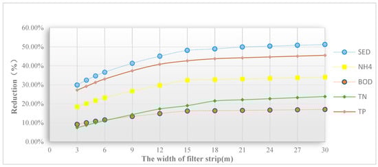 Based on the above scenario, the improved SWAT model was used to simulate the generation of NPS pollutants with different filter strips. The evaluated pollutants were SED (sediment or suspended particulate), BOD (biochemical oxygen demand), NH4 (ammonia nitrogen), TN (total nitrogen), and TP (total phosphorus). With the original condition as a blank scenario, we simulated the reduction effects of the riparian filter strips on various pollutants with different structural designs, depicted in Figure 11. The NPS generation and reduction rate are listed in Table 5.