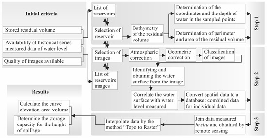 The method is intended to be applied to a reservoir of medium or high storage capacity. For that purpose, three criteria should be taken into consideration: (i) the effective storage volume; (ii) the availability of historical data on water levels (this criterion is used both in reservoir selection as well as in the choice of orbital images used to determine the area occupied by the water surface for a given water level at a certain date); and (iii) the quality of available images.