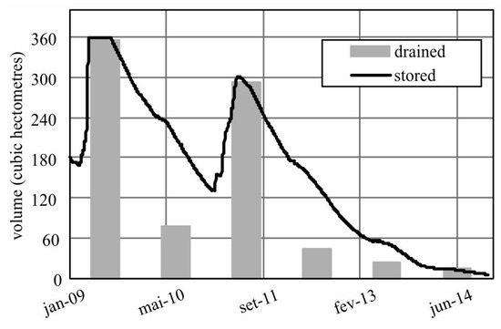 Inflow (annual drained volume) and stored volume of the Pentecoste reservoir from 2009 to 2014.