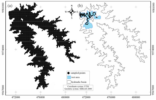 Spatial distribution of points shown on the Pentecoste reservoir by: (a) the conventional bathymetric survey method (CBS: it is not possible to view the separate points due to their high density); and (b) the bathymetric survey using remote sensing simplified method (BRS (bathymetric survey and remote sensing)).