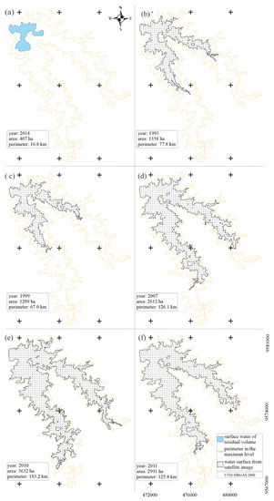 In (a), the figure compare the surface water of residual volume with the area/perimeter in the maximum water storage capacity. From (b–f) the figures show the flooded water surface of the Pentecoste reservoir obtained from Landsat 5 TM images in relation to the maximum water storage capacity.