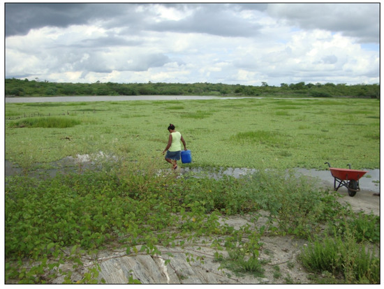The results obtained through the proposed method evidence the importance of using remote sensing to assess the effective water storage in reservoirs. One of the steps in the process is to assess the flooded area at different levels, since the characteristics of bank occupancy around the reservoir, combined with the qualitative aspects of the stored water, may cause difficulty in the exact definition of classes and occupation, in particular with water bodies and vegetation. This information was obtained through the interpretation and analysis of satellite images [32]. The process occurs first, depending on the degree of eutrophication of the reservoir (recurrent in Brazilian semiarid region [4,45]), which promotes considerable changes in the spectral behavior of water [15,16,46,47]). Eutrophication contributes to the formation of a gradual stratified zone that connects the water body with surrounding vegetation; they become more prominent when there is aquatic vegetation (i.e., macrophytes—Figure 6) in the reservoir [33,34].