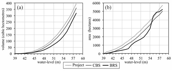 Water-level–volume (a); and water-level–area (b) curves of the Pentecoste reservoir (Project—original curves; CBS—Conventional bathymetric survey; BRS—Bathymetric survey using Remote Sensing simplified method).