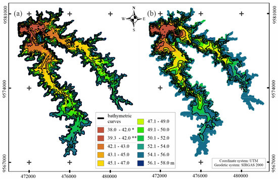 Bathymetric curves and dimensions of the Pentecoste reservoir morphology: (a) CBS (Conventional bathymetric survey); and (b) BRS (Bathymetric survey using Remote Sensing simplified method).