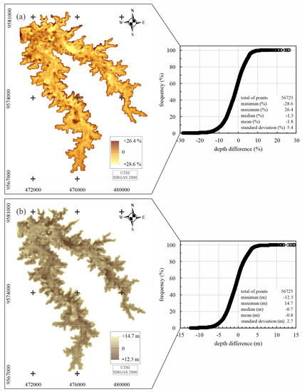 The deepest points (∼20 m) are located near the dam (northwest region of the map, Figure 9), whereas the most divergent depths between the surveys are located elsewhere. These figures show that more than 90% of the surveyed points have differences below 10% of their depths. Therefore, at greater depths, the conditions are similar, showing that the limitations in data collection when using the BRS method do not cause major distortions in deeper places. This demonstrates an important factor for the future use of this method, since it illustrates feasibility and representativeness of terrain features with the largest accumulation of water in a reservoir.