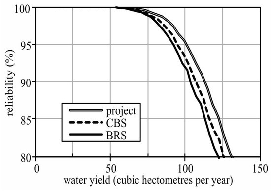 Water yield (availability) versus annual reliability for the Pentecoste reservoir as a function of the morphology (elevation-area-volume curves). Project—original curves; CBS—Conventional bathymetric survey; BRS—Bathymetric survey using Remote Sensing simplified method.