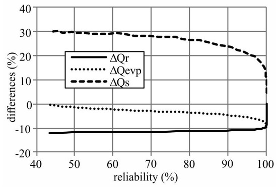 Difference between the main water-balance variables in the Pentecoste reservoir as a function of the annual reliability: = []/, in which is the water yield; = []/, in which is the evaporation discharge; and = []/, in which is the spillway overflow discharge.