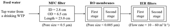 The physicochemical characteristics of the MFC filter and the RO membrane are summarized in Table 1. The RO permeate was polished with two serially connected IER filters (Dowex Monosphere MR-450 UPW, Dow Chemical, Midland, MI, USA). Each IER filter had the H+ exchange capacity of 1.9 eq L−1 and the OH− exchange capacity of 1.0 eq L−1 (Table 1). The specifications of the IER filter are provided in Table 2.