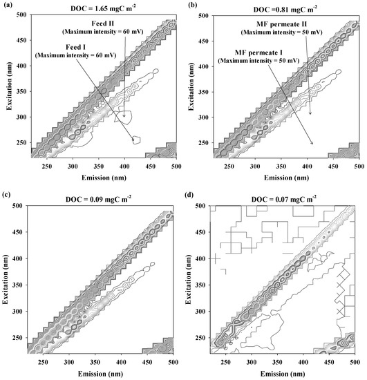The 3D FEEM of DOM in feed and treated waters are illustrated in Figure 2. Two pairs of humic-like fluorophores were detected for the feed water at excitation wavelength (Ex) = 250 nm/emission wavelength (Em) = 430 nm (Feed I; the maximum intensity = 60 mV) and Ex = 300 nm/Em = 400 nm (Feed II; the maximum intensity = 60 mV) [22]. Despite the considerable decrease in DOC concentration, the intensities of humic-like fluorophores were slightly lower after treatment with the MFC filter (the maximum intensity of MFC permeate I at Ex = 250 nm/Em = 430 nm = 50 mV; the maximum intensity of MFC permeate II at Ex = 300 nm/Em = 400 nm = 50 mV). In addition, distinctive humic-like fluorophores were not observed for the RO and IER permeates due to the almost complete removal of DOM (DOC of RO permeate = 0.09 mgC L−1; DOC of IER permeate = 0.07 mgC L−1). These results were in good agreement with the abatement trend of SUVA values through the UPW production system.