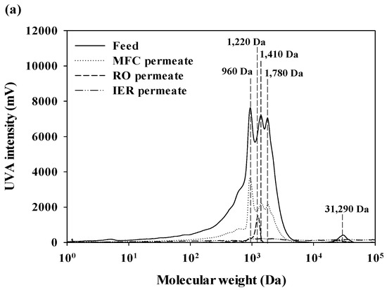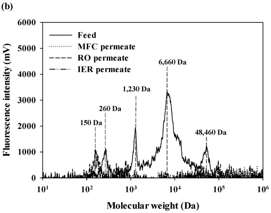 The MW distributions of aromatic and protein-like substances in DOM of feed and treated waters are presented in Figure 3 [23]. The aromatic substances of DOM in feed water contained either low (960–1780 daltons (Da)) or high MW fractions (31,290 Da), with the highest peak at 960 Da (Figure 3a). After passing through the MFC filter, the high MW fraction was completely removed and the UVA intensities of the low MW fractions were substantially decreased. A low MW fraction was found only for the RO permeate at 1220 Da, and its UVA intensity was mostly eliminated after the IER filters. Protein-like substances of DOM in feed water ranged from 150 Da to 48,640 Da, with the highest peak at 6660 Da (Figure 3b). Most MW fractions were effectively removed by the MFC filter, with the exception of the peak at 150 Da. No distinctive peaks were detected for the fluorescence chromatograms of RO and IER permeates. Although the fluorescence detection had higher sensitivity compared to the UVA detection, fluorescence intensities of DOM (the maximum intensity = 3423 mV) were much lower than UVA intensities (the maximum intensity = 6740 mV) [24,25]. Based on these observations, it could be postulated that DOM in feed water is dominantly composed of hydrophobic components.