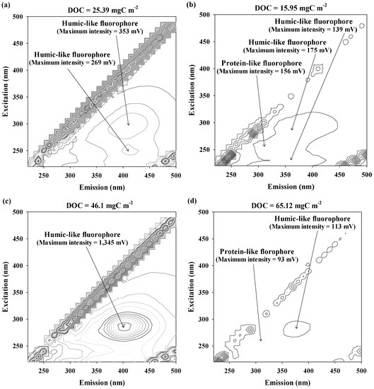 Fluorescence spectral characteristics of DOM in feed and treated waters of the UPW system: (a) Feed, (b) MFC permeate, (c) RO permeate, and (d) IER permeate.