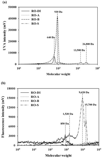 The MW distributions of the desorbed RO membrane foulants using DI water, acid, base, and salt solutions, in terms of aromatic and protein-like substances, are shown in Figure 5. There were no prominent MW peaks for aromatic substances in RO-A and RO-S (Figure 5a). Even though aromatic substances of RO-B included both low (930 Da) and high MW fractions (13,500 Da and 26,800 Da), UVA intensities of high MW fractions (the maximum intensity at 13,500 Da = 1,806 mV; the maximum intensity at 26,800 Da = 2018 mV) were negligible compared to that of low MW fractions the (maximum intensity at 930 Da = 41,787 mV). In addition, a relatively weak peak was observed for aromatic substances of RO-DI at 640 Da (the maximum intensity = 6802 mV). The MW distribution patterns of the protein-like substances (Figure 5b) differed considerably from those of the aromatic substances (Figure 5a), due to significant differences in the major foulant components according to the type of desorbing agent used. No distinctive MW peaks were observed for protein-like substances of RO-A and RO-B. However, the MW distribution of the protein-like substances in RO-S ranged from 1530 Da to 15,700 Da, with the highest peak at 9620 Da (the maximum intensity = 15,043 mV); RO-DI exhibited a very weak fluorescence peak at 850 Da (the maximum intensity = 3398 mV). The absence of prominent UVA peaks and the relatively higher intensities of fluorescence peaks in RO-S clearly showed that RO-S is predominantly comprised of hydrophilic DOM components (i.e., polysaccharide-like and protein-like substances).