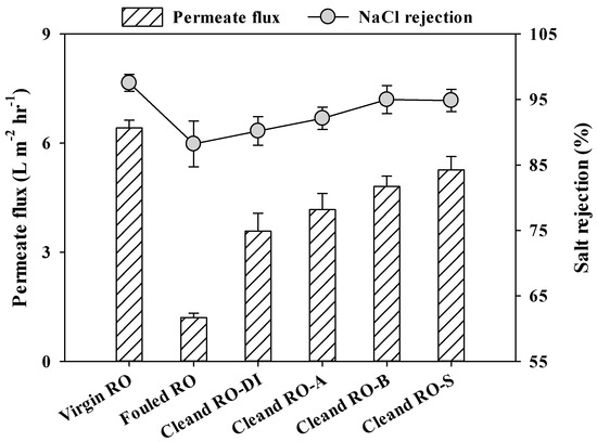 All the applied desorbing agents were effective in recovering salt rejection and permeate flux. However, the recovery rates varied markedly according to the types of desorbing agents. The recovery rates of the salt rejection through the cleaning using DI water, acid, base, and salt solutions were in the order of cleaned RO-DI (salt rejection = 90.1%) > cleaned RO-A (salt rejection = 92.1%) > cleaned RO-S (salt rejection = 94.8%) > cleaned RO-B (salt rejection = 95.0%). Although cleaned RO-B showed a slightly better salt rejection than cleaned RO-S, the differences were negligible (< 0.2%). Unlike recovery rates of salt rejection, recovery rates of permeate flux were strongly associated with the amount of desorbed organic foulants from the RO membrane surfaces (DOC of RO-DI = 25.39 mgC m−2; DOC of RO-A = 15.95 mgC m−2; DOC of RO-B = 46.14 mgC m−2; DOC of RO-S = 65.12 mgC m−2). The recovery rates of the permeate flux through the cleaning using DI water, acid, base, and salt solutions were in the order of cleaned RO-DI (permeate flux = 3.6 L m−2 hr−1) < cleaned RO-A (permeate flux = 4.1 L m−2 hr−1) < cleaned RO-B (permeate flux = 4.8 L m−2 hr−1) < cleaned RO-S (permeate flux = 5.3 L m−2 hr−1), which is consistent with the recovery rates of the negative surface zeta potential and the contact angle with the exception of RO-A. This is because that acid cleaning is more effective for desorbing inorganic foulants than organic foulants. The recovery rates of surface features more influenced by the amount of desorbed organic foulants on membranes surface [21,23,25,30]. Therefore, permeate flux recovery rate of RO-A can be higher than that of RO-DI, even though the surface features recovery of RO-A is lower than that of RO-DI. These observations suggest that salt cleaning can efficiently recover the salt rejection and the permeate flux of the RO membranes used for UPW production [26].