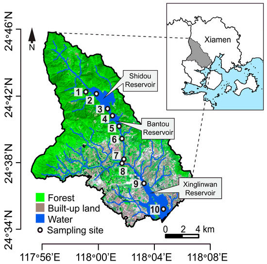 Water samples were collected from the surface layer (<0.5 m) at the mid-point of the Houxi River, located northwest of Xiamen city, Fujian, China (24°34′–24°46′ N and 117°56′–118°8′ E; Figure 1. Houxi River watershed covers 205 km2 of the surface area, with a river length of approximately 25 km. The upstream section of Houxi River is dominated by forested land, and the downstream section drains an urban area of the rapidly growing Xiamen city. The annual mean temperature is 20.7 °C, and the annual mean precipitation is 1335.8 mm in Xiamen [33,34]. A total of 100 samples were collected in January and July of the years 2012–2016, during ten sampling visits at ten sampling sites. In the upstream, pristine area, one sampling site in the headwater (Site 1), and four sites (Sites 2–5) in the lacustrine and riverine zones of two reservoirs (Shidou and Bantou reservoirs; Figure 1) were selected. These reservoirs were constructed to supply drinking water for downstream urban population. The remaining sites, located in the downstream urban area, included two sites in the peri-urban area (Sites 7 and 8) and two sites in the fully urban area (Sites 9 and 10; Figure 1).