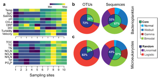 Along the spatial gradient of the studied river–reservoir system, the number of sequences of the core and random categories exhibited distinct patterns (Figure 3a). The core community increased at the reservoir sites in the upstream region and decreased at the downstream river sites. The random category showed an opposite trend, with a decreasing number of sequences in the lentic sites and an increased number at the lotic sites. This observation was common between the bacterioplankton and microeukaryote communities.