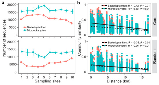 Plankton community variation along the Houxi River continuum. (a) Changes in the bacterioplankton and microeukaryote sequences classified as core and random, respectively. (b) Distance–decay of core and random plankton community similarities measured using the Bray–Curtis distance. Mantel’s correlation coefficients (R) and the p-values are shown. The error bars in (a) represent the standard error of the mean (n = 10).