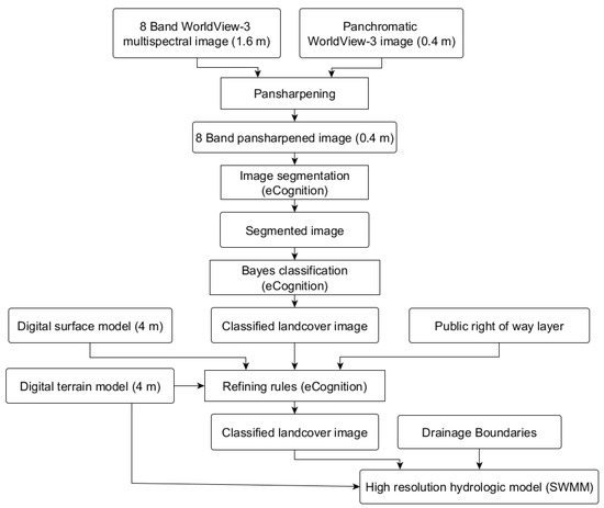 An overview of the current study is outlined in Figure 1, where pansharpening techniques were first used to increase the resolution of multispectral satellite imagery, followed by image segmentation dividing the image into objects with homogeneous spectral properties. The objects were classified based on a machine learning classifier and further refinement was carried out with a set of refining rules. Detailed land cover results and topographic data aided in the parameterization of an urban runoff model of the study area for a baseline conditions scenario and three Sponge City scenarios. Design storms representing six different return periods were finally used as model input to evaluate the runoff volume reductions in the three Sponge City scenarios as compared to the baseline.