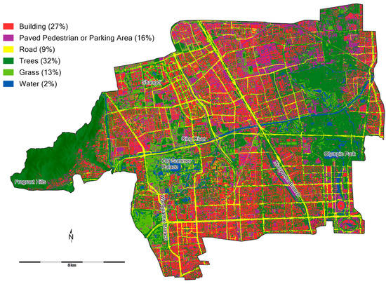 Classification results for the whole study area (Figure 5) showed that impervious areas (i.e., buildings, PPPA, roads) and green areas (i.e., trees, grass) account for approximately 52% and 46% of land cover, respectively. The trees class was the largest, covering nearly a third of the study area. The total tree area is likely slightly overestimated considering that tree canopy may extend beyond the pervious area where the trees are planted in some cases. Green areas are scattered throughout the whole study area, however are much more concentrated in the areas of Fragrant Hills and Old Summer Palace in the west and the Olympic Park in the east (Figure 5).