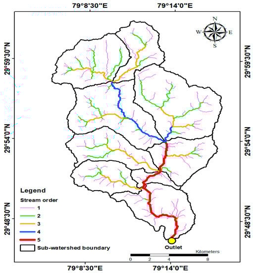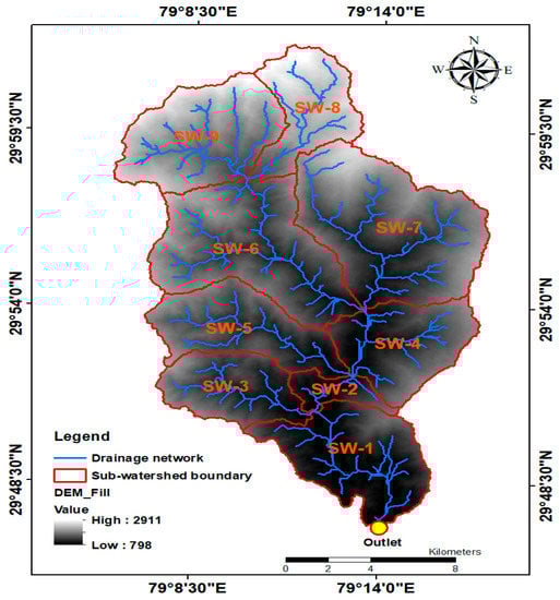 The boundary of BW was marked by using Topo-sheet Nos. 53-N/4, 53-N/8, 53-O/1 and 53-O/5 of Survey of India (SOI) on a scale of 1:50,000 for delineation of watershed. Topo-sheets were scanned (tiff format) and geo-referenced to frame complete image of the region using mosaic operation. The mosaicked image was imported in QGIS and the BW boundary was digitized by monitoring the ridge points from the contours. The outlet position was set at the confluence point of BW with the Ramganga river. The DEM of BW and its SW with drainage network pattern created in ArcGIS 10.2 environment is depicted in Figure 2. The DEM was downloaded from https://earthexplorer.usgs.gov; it is Advanced Space-borne Thermal Emission and Reflection Radiometer (ASTER) resolution is 30 m × 30 m. The BW was divided into nine SW, and codification was done in increasing order from the outlet at BW to the furthest distant sub-watershed as SW-1 to SW-9. The stream order of nine SW of BW is depicted in Figure 3.