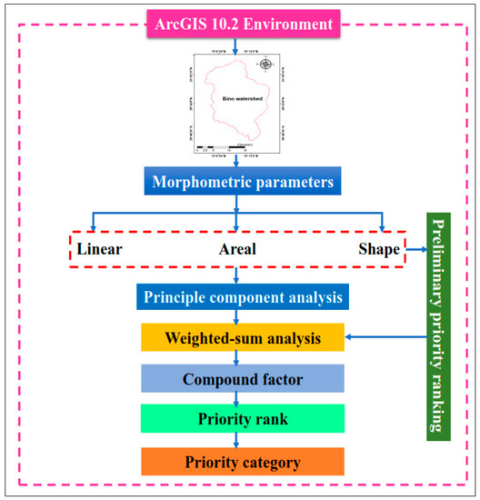 Past studies reported that the SW prioritization was carried out based on compound factor values, which are calculated by taking a simple arithmetic average of preliminary priority ranks for final prioritization of SW. In previously used methods, equal importance was given to all the morphometric parameters, which may not be true in reality [1]. In identification of highly susceptible areas for risk assessment and management, the importance of all the input constraints may not be equal as each SW has its own characteristics. In recent years, a few separate studies have been conducted using weighted-sum analysis for watershed prioritization based on morphometric parameters [1,22,28,29,30], as well as principal component analysis for watershed prioritization [23,25,26,27]. The recent implementation of the hybridization between the PCA and WSA demonstrated an optimistic strategy for SW prioritization. Therefore, the current study is devoted to prioritize nine hilly SW of the BW based on morphometric parameters. The modeling procedure is established using morphometric parameters including: (i) linear: mean stream length, basin area and perimeter, stream length, basin length, bifurcation ratio, and stream order; (ii) areal: texture ratio, drainage density, mean length of overland flow, and stream frequency; and (iii) shape: compactness coefficient, form factor, circularity ratio, and elongation ratio. The main objective of doing this research was to provide a reliable methodology for SW prioritization at the BW, contributing to multiple water resource engineering disciplines. This is highly essential for such a region where the reliable watershed management and sustainability is very much needed.