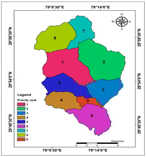 The assignment of the preliminary priority rank (PPR) of 9 SW was performed using a liner , areal (), and shape () morphometric variables. The linear and areal morphometric parameters have direct relationship to the soil erodibility; higher value of these parameters indicates more erodibility potential. Thus, the largest value of linear and areal parameters was assigned rank 1 (highest priority), the next highest value was assigned rank = 2, and so on for all the SW [5,16]. The shape morphometric parameters have inverse relationship to the soil erodibility; lower value indicates more erodibility potential. Thus, the lowest value of shape parameters was assigned rank 1, and the next-lowest was assigned rank 2, and so on for all the SW [5,16]. When the linear, areal, and shape morphometric parameters of two sub-watersheds have a similar value, an equal rank was assigned to such SW [22,40].