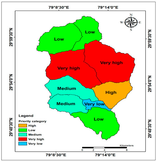 For the final priority ranking, it was ensured that the lower CF value was assigned rank 1 while the next lower got rank 2, and so on for the rest of the nine SW (Table 12). As Table 12 clearly shows, the SW-6 assigned PR as 1, SW-7 assigned PR as 2, SW-4 assigned PR as 3, SW-3 assigned PR as 4, SW-5 assigned PR as 5, SW-1 assigned PR as 6, SW-8 assigned PR as 7, SW-9 assigned PR as 8, and SW-2 assigned PR as 9. Also, Figure 5 illustrates the final priority rank map of nine SW of BW under observation. Table 13 shows the priority category of nine SW of BW based on CF value. The nine SW have been grouped into the five-priority category [1,22]: (i) very high (1.918 to ≤ 3.161); (ii) high (3.161 to ≤ 4.403); (iii) medium (4.403 to ≤ 5.646); (iv) low (5.646 to ≤ 6.888); and (v) very low >> 6.888 (Table 13). Table 13 clearly shows the sub-watersheds SW-6 and SW-7 under very high category, SW-4 under high category, SW-3 and SW-5 under medium, SW-1, SW-8, and SW-9 under low category, and SW-2 under very low category. Figure 6 is the final priority map of nine SW, which demonstrates the percentage area under very high (37.81%), high (9.53%), medium (17.73%), low (32.52%), and very low (2.41%) categories, respectively.