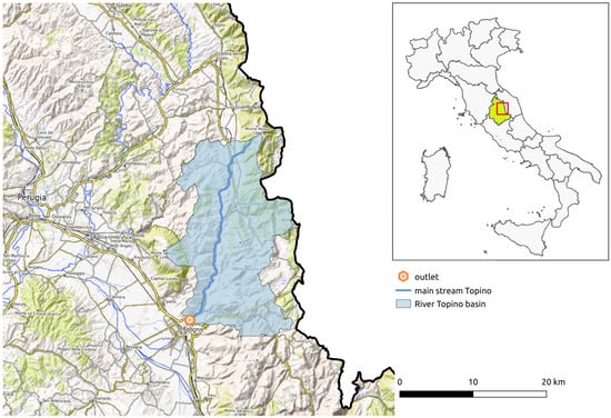 One of the most important rivers in the Umbria region in central Italy is the Topino River, a tributary of the Tiber River. This river belongs to the hydrographic basin of Topino-Marroggia, which incorporates two different basins: the basin of Marroggia-Teverone-Timia and the basin of the Topino River (Figure 2). The Topino River Basin is about 250 km2, with a length of 35 km and an elevation drop of 430 m.