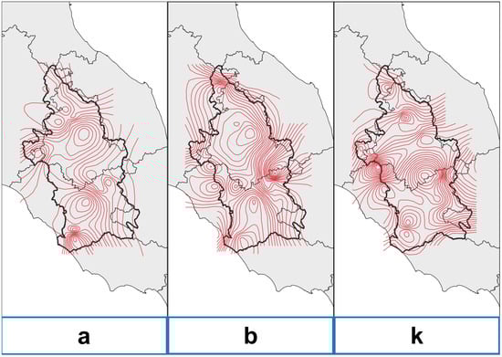 Values of Intensity-Duration-Frequency parameters a, b, and K expressed as isolines, provided by the Flood Estimation Handbook for the whole Tiber River Basin.