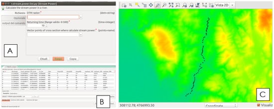 (A) The user interface of the r.stream.power, the module of GRASS GIS. Required inputs are vector points that represent the locations of cross-sections at which the stream power and DEM should be calculated. (B) The model output represented by a vector points layer; the attribute table contains, in detail, all of the code-calculated parameters, such as discharge, downstream channel length from the source point, local elevation, elevation drops, upslope for several distances, and the TSP for upslope distances of 100, 200, and 400 m. (C) Output points generated by the code plotted over the DEM used as input.