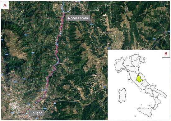 (A) Identification of points along the studied reach of Topino River (from Google Hybrid). (B) Visualization of the Umbrian region overlapped by the Topino River main channel.