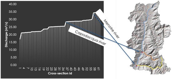 The discharges listed in Table 1 are plotted in Figure 7. The discharge presents two big increments: the major one, which corresponds to the confluence of an important tributary (Menotre River); the second one, which corresponds to the confluence of a small river coming from the left, close to the outlet of the Topino Basin.