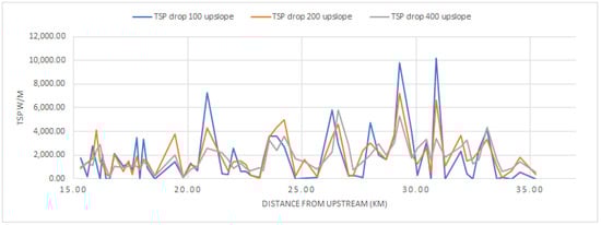 - Peak #1 is located 20.8 km downstream with a TSP value of 7250 W/m for an upslope distance of 100 m, 4295 W/m for an upslope distance of 200 m, and 2584 W/m for an upslope distance of 400 m. In this cross-section, the high value of the TSP was due to the local slope (about 1.8%) and discharge.
