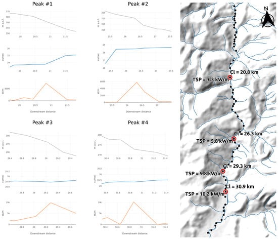 - Peak #3 is located 28.7 km downstream, with a TSP that ranged from 5286 W/m–9821 W/m. In this cross-section, the increase in the TSP was related to high values of the local slopes (about 3.5%).