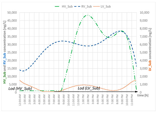 The average concentrations of the key compounds were evaluated by assuming the different sampling modes. Note that, with regard to Figure 1, for the substances HV_Sub and LV_Sub, during the night their concentrations decrease below the corresponding Lod (according to the adopted analytical methods, but this issue is beyond the current study). For the sake of caution, it was assumed that the concentration was equal to the Lod (respectively 1000 ng/L and 100 ng/L). In addition, their corresponding limits of quantification (Loq) were assumed equal to 2500 ng/L and 250 ng/L: when their concentration was below the corresponding Loq, it was set equal to 0.5 Loq, according to [24].