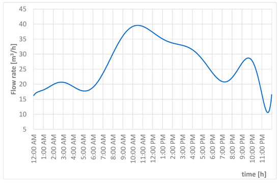 As to flow rate, the study refers to a small urban settlement, which, according to the technical literature, is characterized by enhanced variations at well-known day hours [20]. A very similar flow pattern was found for the effluent of a medium-large hospital [12,21,22]. In this context, an ad hoc curve of flow rates versus time (during a typical day) was defined on the basis of literature data and evidences [20,21] (see Section 2.2).