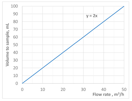 With regard to the flow proportional sampling mode, in order to define the direct proportionality curve between wastewater to be sampled and the flowing wastewater flow rate, the expected range of variability of the flow rate has to be known. In the case study, the observed range varied between 17.3 m3/h and 38 m3/h but, for the sake of caution, it was supposed that it might vary between 10 m3/h and 50 m3/h. It was then supposed that in the case of a flow rate of 10 m3/h, the volume to sample would be equal to 20 mL, and in the case of 50 m3/h, the volume to sample would be 100 mL, resulting in the linear relationship between volume to sample (y) and flow rate (x) y = 2x (Figure 3). Other direct proportional curves could be assumed for different cases.