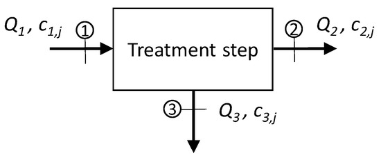 As discussed in [25], with regard to a generic wastewater treatment step (Figure 4), the percentage efficiency in removing a specific contaminant j is defined on the basis of the mass loading (corresponding to the product: concentration × flow rate) in its influent (stream number 1) and effluents (stream numbers 2 and 3) at a set time interval, in accordance with Equation (12):