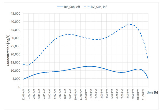 Finally, referring to RV_Sub, the highest average concentration was found with the grab sample taken at 8:00 a.m. and the lowest average concentration with the 24-h composite sampling mode (three samples taken every eight hours). It is important to observe that the highest value does not correspond to the maximum concentration of the RV_Sub profile of concentration: 38,298 ng/L occurring at 8:35 p.m.