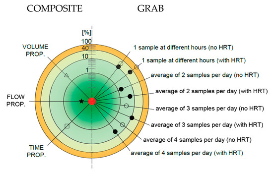 The target graph in Figure 8 reports and compares the percentage deviations (=) between the ideal removal efficiency (67.8%, corresponding to the red circle in the center) and the values found following the different sampling modes.