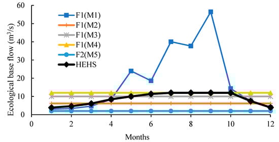 Establishment of the healthy eco-hydrological sequence of rivers based on response relationship of hydrological process and ecological functions of river ecological base flow. Notes: F1(M1) refers to the water requirement of the ecological function of protecting from drying-up rivers (F1) calculated by Tennant (M1), and also, F1(M2), F2(M3), F3(M4), F3(M5) are similar to F1(M1), F1, F2, F3, M1, M2, M3, M4, M5 as shown in Table 1. HEHS refers to the water requirement of the healthy eco-hydrological sequence of rivers.