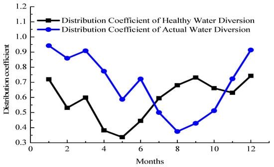 In order to analyze the effects of the water diversion in the Baoji section of the Weihe River, the distribution coefficient of healthy water diversion and the actual diversion coefficient of water diversion were calculated (see Figure 3).