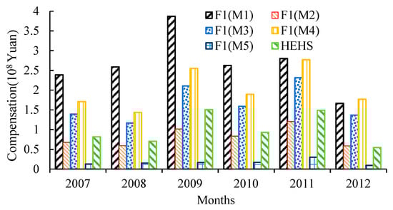 Therefore, it is necessary to compensate the farmers for restricting the use of agricultural water usage, and the amount of compensation should not only cover the expenses for maintaining the rights and interests of the owners and users of water resources but should also be aimed at restoring the healthy eco-hydrological sequence of rivers, to promote a harmonious development. The agricultural water shortage caused by the healthy eco-hydrological sequence of rivers was calculated by the product of water shortage of restoration of healthy eco-hydrological sequence of rivers (see Table 2) and irrigation water utilization coefficient in Baojixia Yuanshang Irrigation Areas (see case study analysis). The results of compensation for agricultural economic losses caused by the restoration of the healthy eco-hydrological sequence of rivers and effects of restoration on individual ecological functions are calculated by using Equation (8), which as shown in Table 3.