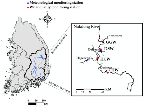 The target sites of this study were the Gangjeong Goryeong (GGW), Dalseong (DSW), Hapcheon Changnyeong (HCW), and Changnyeong Haman (CHW) weirs on the Nakdong River, South Korea. These weirs are among the eight weirs installed on the Nakdong River as part of the Four Rivers Project (Figure 1) and are located in the midstream and downstream regions. The GGW, DSW, HCW, and CHW watershed areas (i.e., total water storage capacities) are 11,667 (92 million m3), 14,248 (59 million m3), 15,074 (70 million m3), and 20,697 km2 (101 million m3), respectively []. The CHW is the most downstream weir of the Nakdong River. Since the weirs were completed in 2012, algal blooms have occurred frequently due to cyanobacteria overgrowth in summer. The highest level of the harmful cyanobacteria cell density guideline of the World Health Organization (WHO), i.e., 20,000 cells mL−1, has been exceeded 36 (peak: 261,219 cells mL−1), 69 (peak: 495,360 cells mL−1), 95 (peak: 1,264,052 cells mL−1), and 80 times (peak: 715,993 cells mL−1) at GGW, DSW, HCW, and CHW respectively []. The overgrowth of harmful cyanobacteria in the Nakdong River has emerged as a social issue because this river is an important water source for 13 million citizens living in the Daegu, Busan, and Gyeongnam regions.